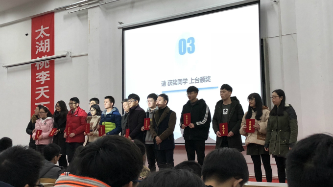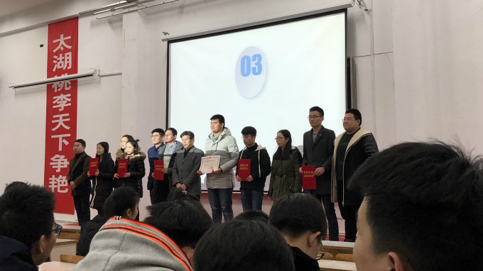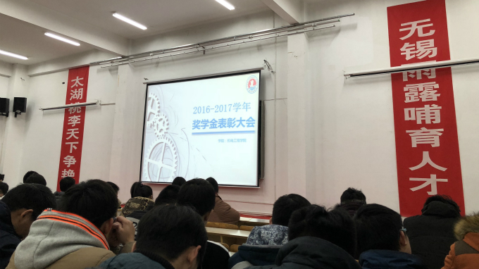 表彰大会一共分为4项议程。首先,由机电工程学院党总支副书记杨学圣致辞并宣读《关于表彰2016-2017学年各项奖学金获得者的决定》。接着,国家奖学金、太湖之星“学习之星”获得者张杰同学录制了视频,表达了自己的感想。通过视频,我们看到了张杰同学用努力拼搏证明了自己的实力,用刻苦奋斗书写了年度的辉煌。