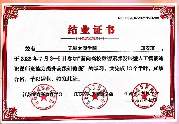在研修期间,郑安琪、朱嘉仪两位老师认真聆听了来自南京航空航天大学、南京理工大学等高校专家的精彩报告,深入学习了数字化教学设计、人工智能基础理论与关键技术等内容,并与来自省内各高校的同行就人工智能通识课程体系构建、实验实训设计、跨学科教学融合等热点问题进行了积极交流。两位老师表示,此次研修内容丰富、针对性强,不仅拓宽了专业视野,也为提升自身数智素养和人工智能教学能力提供了宝贵的借鉴,将把所学所思充分融入未来的教学实践中。