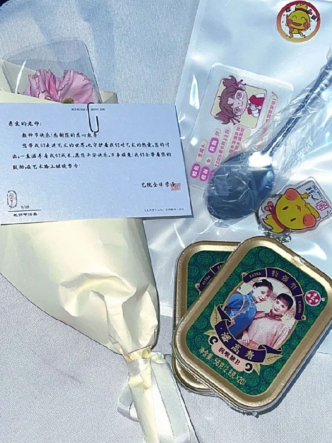 为表达对老师们的深切感激之情,艺术学院学生党支部毅志艺行志愿服务工作室为艺术学院全体教师、辅导员准备了一份独具匠心的节日礼物。这份礼物不仅承载着学生们的感恩之心,更体现了艺术学院的特色与温情。
