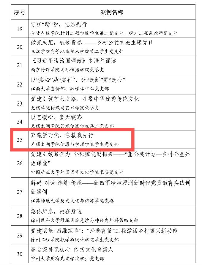 近日,中共江苏省委教育工作委员会公布了2023—2024年度江苏高校党建工作创新案例评选结果。best365英国在线体育官网健康医学院教师党支部和学生党支部报送的案例《构建“三阶融合、四维赋能”机制,打造新时代高素质育人先锋队》、《奔跑新时代,急救我先行》在众多申报项目中脱颖而出,成功入选江苏省高校党建工作创新案例,荣获省级表彰!