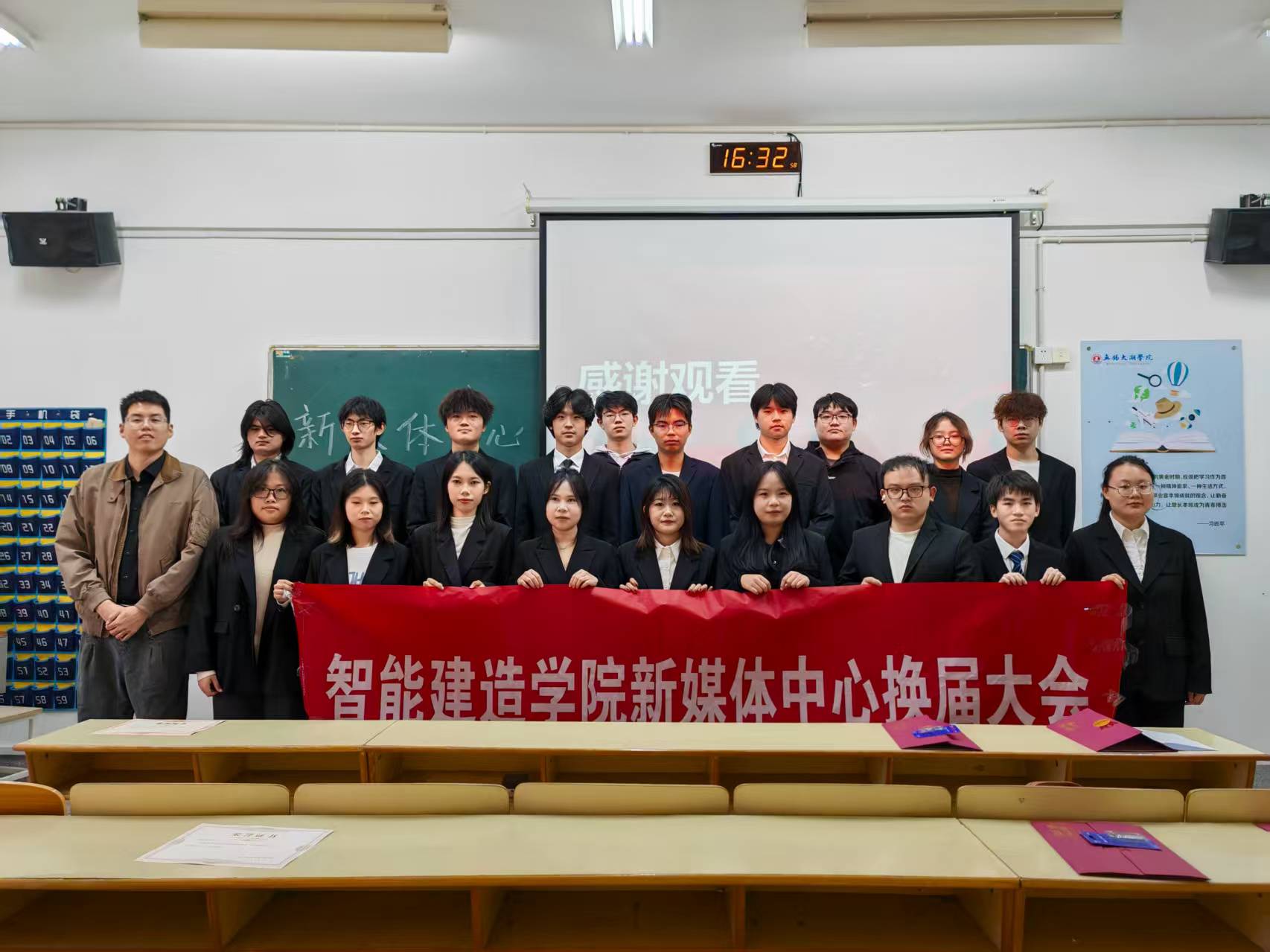 会议最后,全体参会人员齐聚一堂合影留念,镜头定格下这承前启后的珍贵瞬间。至此,智能建造学院新媒体中心换届大会圆满落幕。新旧交替间,责任顺利交接,新成员的加入为新媒体中心注入了新鲜活力与蓬勃朝气。相信在新一届成员的团结协作、锐意进取下,中心未来的工作必将不断取得新进展、实现新突破,为学院的繁荣发展持续贡献青春力量。