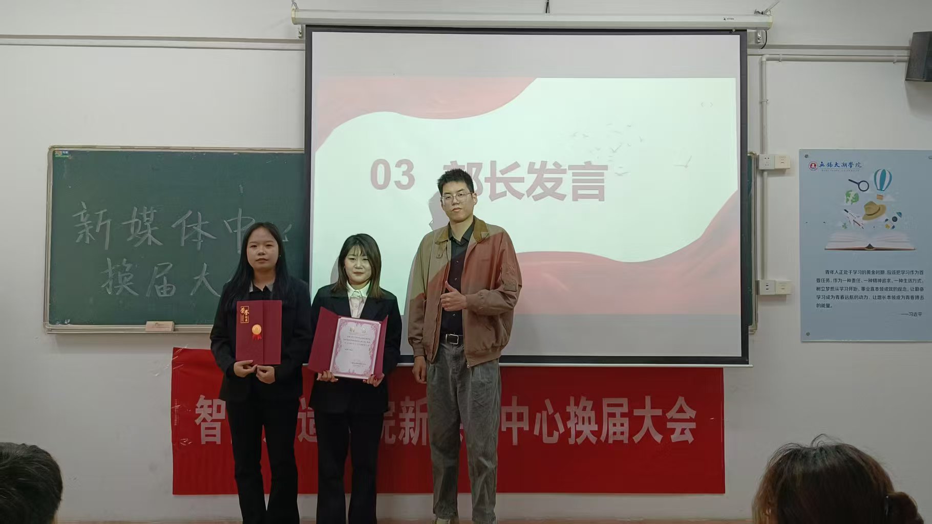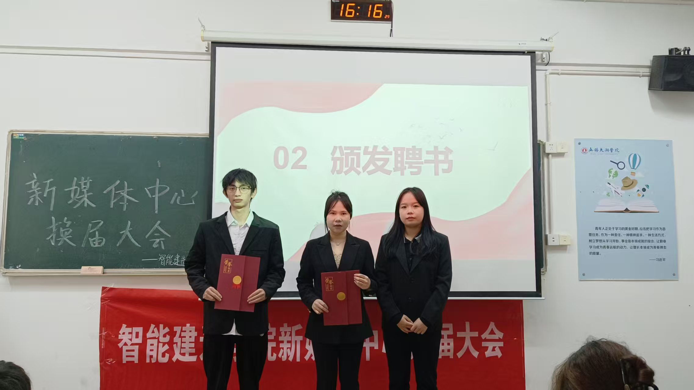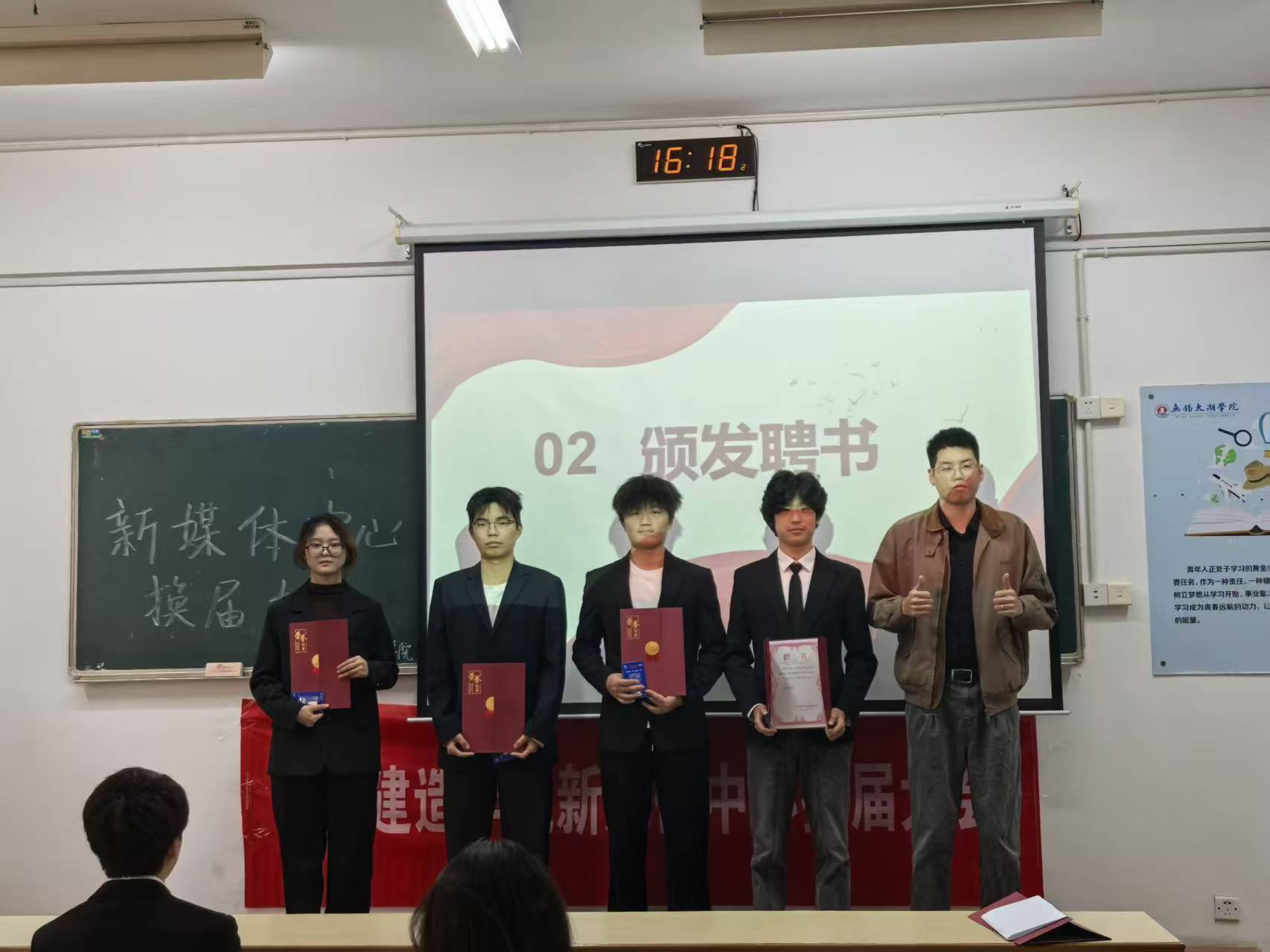 紧接着,聘书颁发环节如期举行。李老师分别为新任主席及新成员颁发聘书,岑兰同学则为新任部长授聘。一纸聘书,承载着对新成员能力的认可与信任,更寄托着对他们助力新媒体中心发展的殷切期许;对于新任部长而言,这既是对过往工作成果的肯定,更是希望他们以丰富经验引领新成员成长、凝聚团队力量的深切厚望。