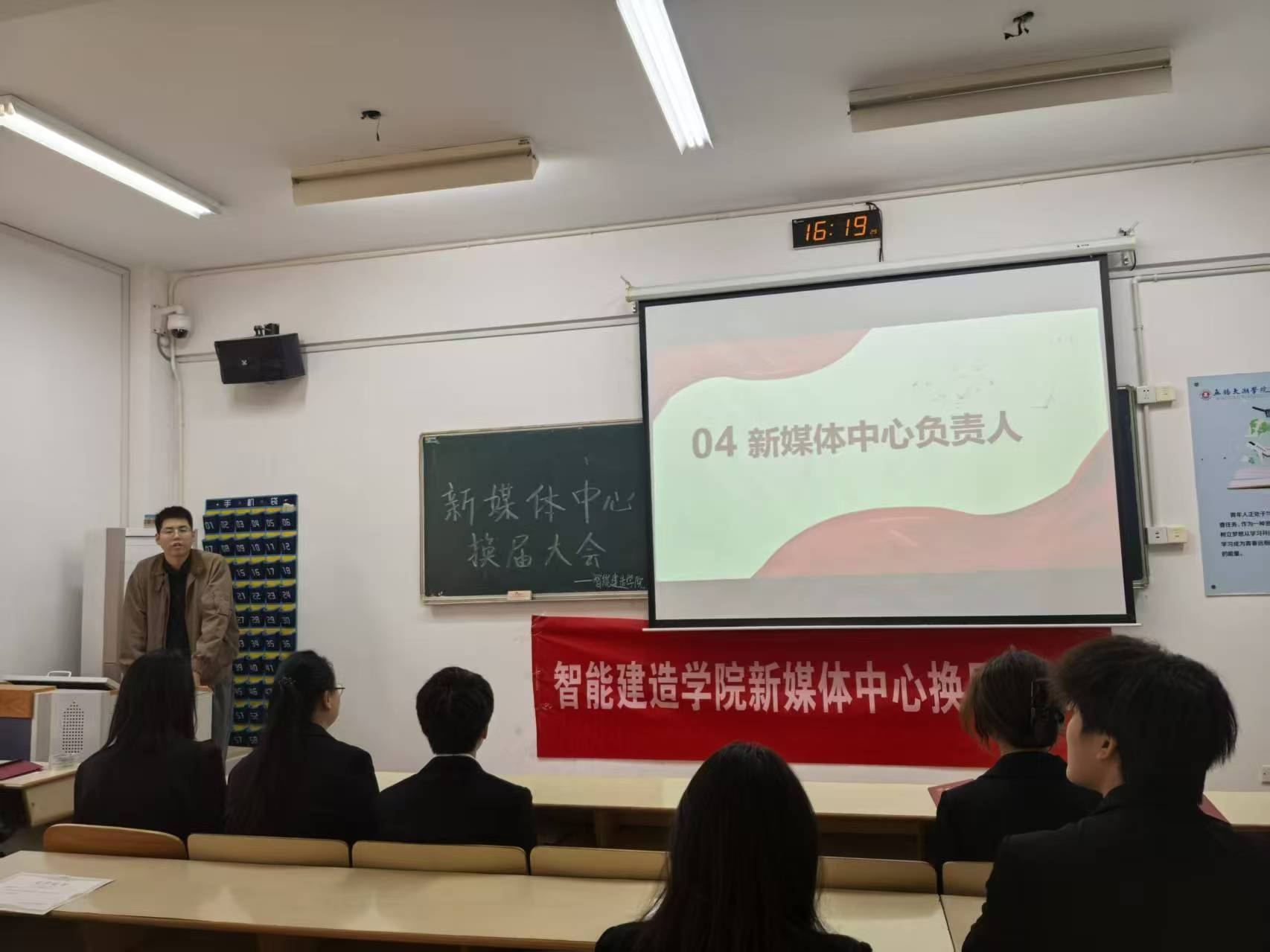 承续初心,聚力前行。为推动智能建造学院新媒体中心持续焕发活力、稳步迈向新发展阶段,智能建造学院新媒体中心换届大会于 2025 年 11 月 13 日下午在 8 号楼 114 教室顺利举办。本次大会由黄嘉祺同学主持,李冀湘老师受邀出席,并担任颁奖嘉宾,与全体部员共同见证责任交接的重要时刻与新征程的正式启幕。