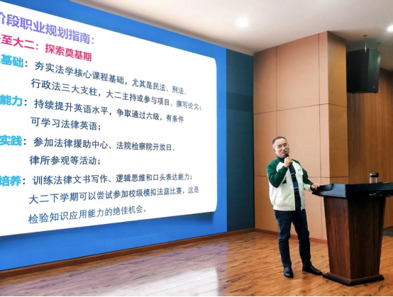 接下来,徐院长结合自身深耕领域的丰富经验,从社会对法学人才的需求导向、高校人才培养规律出发,为同学们带来了干货满满的分享。他详细解读了法学专业的多元就业方向,涵盖法官、检察官、律师、法律顾问、公共管理、学术研究等多个领域。徐院长还拓展到企业法律顾问、政府公共管理、高校学术研究、知识产权服务等新兴领域,让同学们对法学职业版图有了更全面的认知,并针对“如何搭建职业竞争力体系”“校园到职场的过渡技巧”等同学们关心的问题,给出了具体可行的建议。