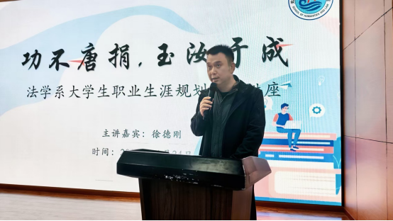 讲座伊始,文法学院党总支副书记俞昊波开场致辞,对徐院长的莅临表示热烈欢迎与诚挚感谢,并强调了职业规划对法学学子成长成才的重要意义。他提到,法学专业的同学们承载着守护公平正义的使命,而清晰的职业规划能帮助学子将专业知识转化为职场竞争力,在法治道路上稳步前行。