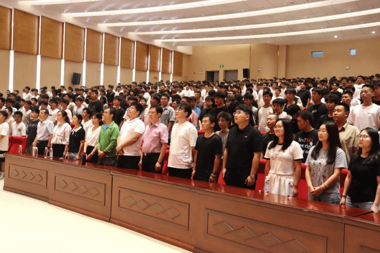 仪式开始,典礼以全体人员肃立奏唱《中华人民共和国国歌》拉开帷幕,庄重的旋律点燃新生的归属感与使命感,为这场入学 “第一课” 奠定奋进基调。