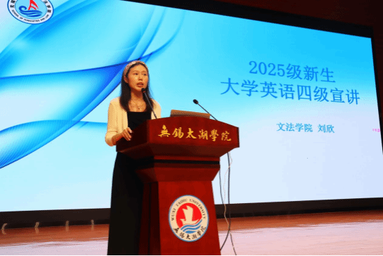 学校大学外语骨干教师刘欣宣讲大学英语四级考试。介绍提升英语能力的方法和备考技巧,同步给出“3个月/1年备考计划”(基础阶段攻词汇语法、巩固阶段练真题、冲刺阶段整套刷题)等详细指导方案。