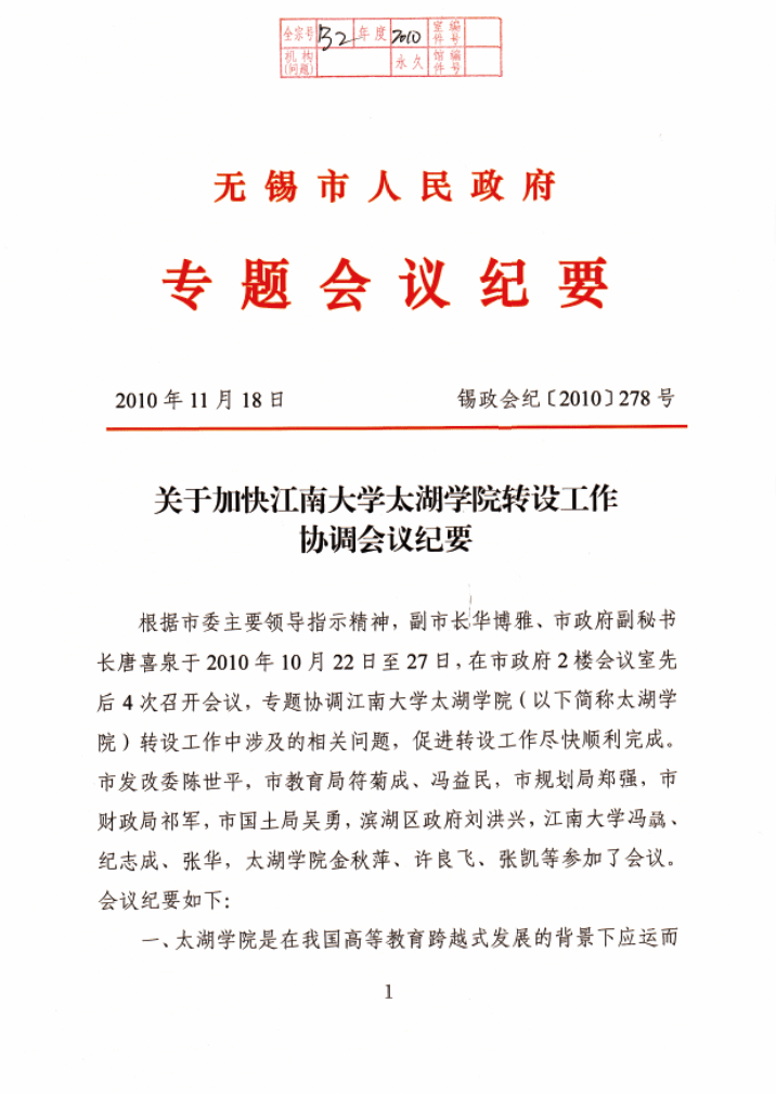 2010年,无锡市委召开会议推进江南大学太湖学院转设工作