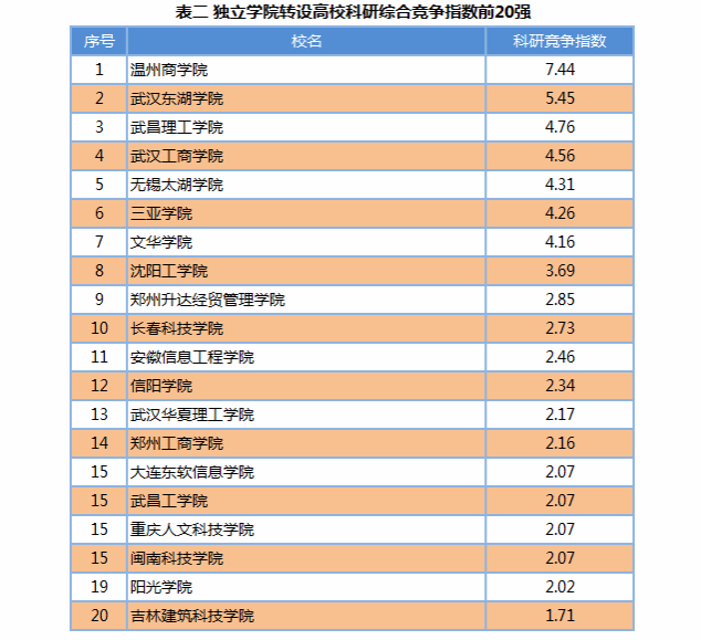 本网讯 “中国地方新建(应用型)本科高校综合竞争力排行课题组”(ICAUR)近日发布了“独立学院转设高校科研综合竞争指数”。温州商学院、武汉东湖学院、武昌理工学院位居前三甲。