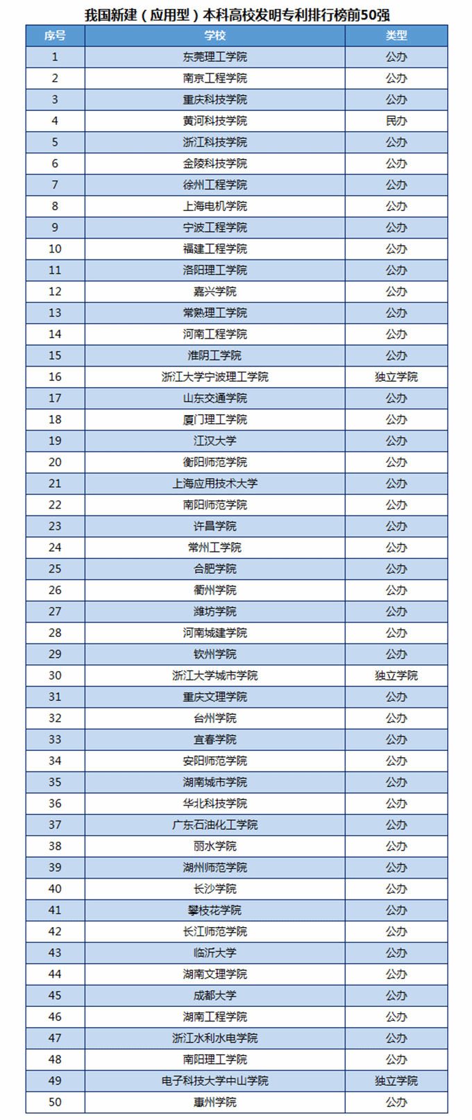我国新建(应用型)本科高校发明专利排行榜前50强见下表。