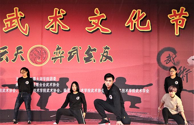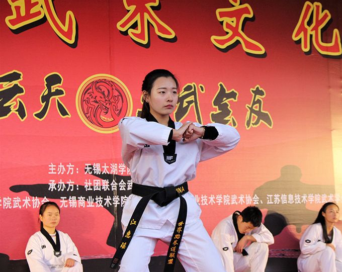 武协ITF跆拳道表演率先出场。跆拳道以腿法为主,以强有力的腿击而闻名,其腾空和转身腿法最为出众。江南大学武术协会带来的咏春拳表演亦不逊色,太极单刀融合太极的行云流水、刚柔并济,惊艳众人,掌声不断。无锡职业技术学院的传统武术表演、本校武术协会的空手道表演、无锡商业职业技术学院散打表演皆赢得阵阵喝彩。期间现武协会长付亚东带来即兴表演徒手劈砖,引起阵阵惊叫,掀起本次活动的又一次热潮。