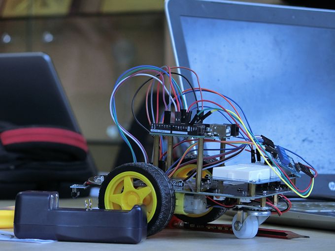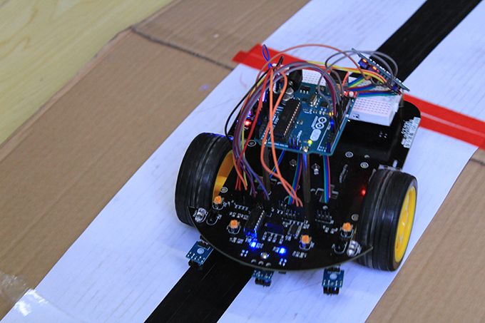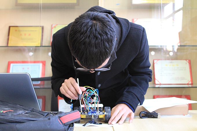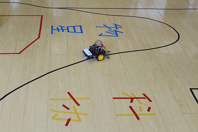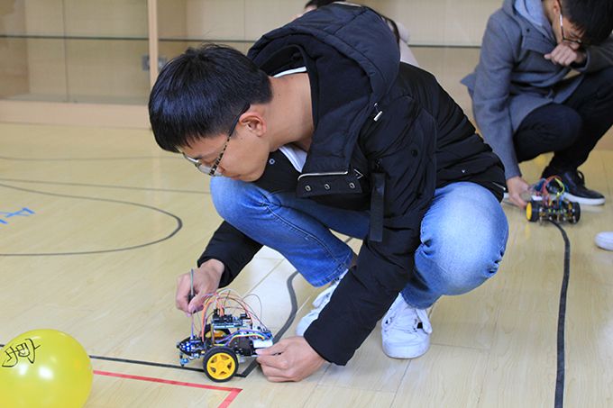此次竞赛由物联网之星科技协会举办,共有7名2017级新生参赛。下午2:30竞赛正式开始,选手们首先对自己的寻迹小车进行调试。竞赛赛道模拟了救灾场景,设置了多重路障,第一轮七名选手按照抽签顺序轮流上场,按加分制决出了前三名。10分钟的休息时间后,第二轮比赛以计时的标准决出冠亚季军。物联网1702的张嘉业同学勇夺冠军。