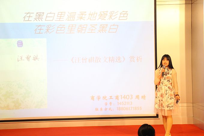 50名参赛选手分别作了精彩演说,讲述了自己心目中的一本好书,分享了自己与众不同的阅读体验,给大家带来了一场丰盛的文化盛宴。文法学院汉语1402班王丹丹同学介绍了《青铜葵花》,引领大家追寻生命中的真善美;艺术学院工设131班陈丁同学推荐了励志类青春小说《你的孤独虽败犹荣》,用温暖的话语诉说“孤独不是失败,它是自己与自己相处与对话最好的时光”,现场掌声如潮;文法学院法学1502班许晨阳同学带领大家重温经典名著《红楼梦》;工学院电信1501班周闯同学带领大家走进路遥的《平凡的世界》,感受普通人在历史进程中走过的艰难曲折道路;商学院财管1505班钱亚茹同学介绍了台湾作家龙应台的《目送》,伴随着优美感人的音乐,让现场师生感受到其作品温柔婉转仿佛微风吹过麦田;商学院审计133班伍绍芳同学作为大三学生代表,与大家分享了自己阅读网络连载历史小说《明朝那些事儿》的审美体验,让历史变成一部活生生的故事,她结合《明史》阅读该书的经历让大家为之动容。